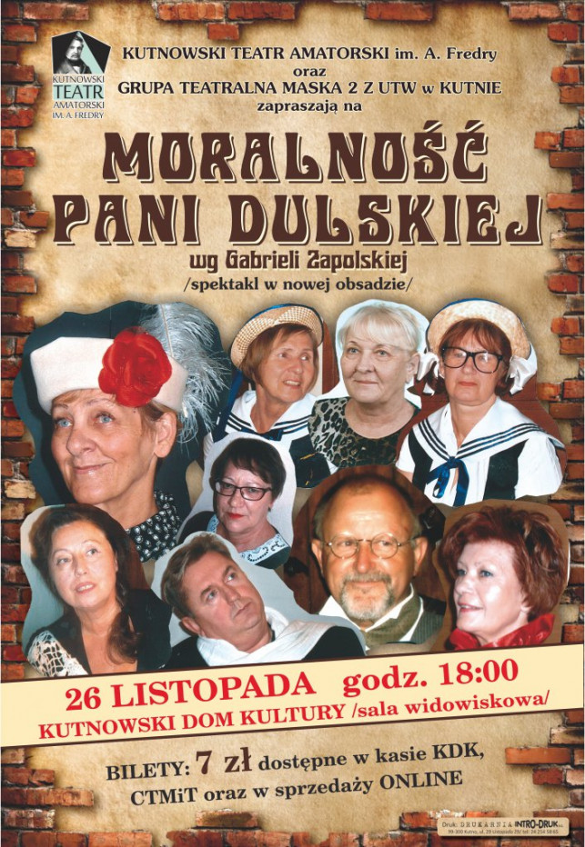Kutnowski Teatr Amatorski im. A. Fredry oraz Grupa Teatralna Maska 2 działająca przy Uniwersytecie Trzeciego Wieku zapraszają 26 listopada o godz. 18.00 na spektakl Moralność Pani Dulskiej, na podstawie komedii Gabrieli Zapolskiej.