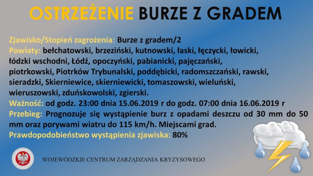 - Prognozuje się wystąpienie burz z opadami deszczu miejscami do 50 mm oraz porywami wiatru do 115 km/h. Miejscami możliwy grad. Prawdopodobieństwo: 80% - ostrzega Wojewódzkie Centrum Zarządzania Kryzysowego.