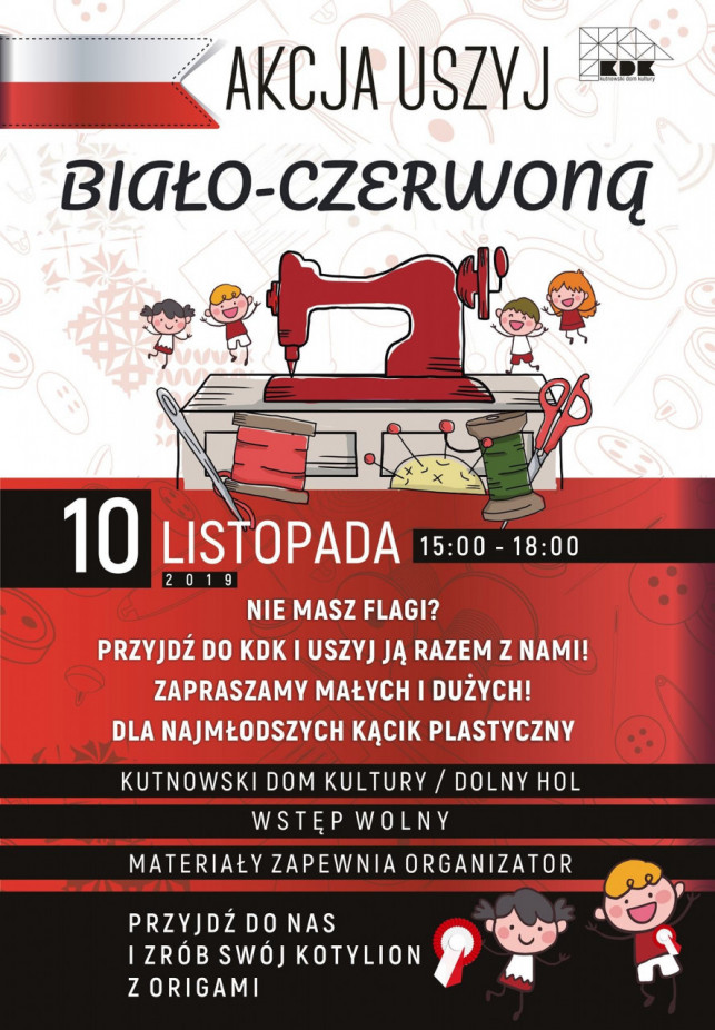 10 listopada w niedzielę w godz. 15-18 będzie można własnoręcznie uszyć biało-czerwone flagi. KDK zapewnia wszystkie materiały i oczywiście pomoc przy wykonaniu. Wystarczy, że przyjdziecie do Kutnowskiego Domu Kultury (dolny hol). Nasza akcja to świetny pomysł na dołączenie się do wspólnego świętowania odzyskania niepodległości, a także okazja do spędzania wolnego czasu w kreatywny sposób.
