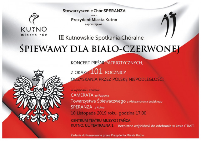 Koncert pieśni patriotycznych "Śpiewamy dla Biało-Czerwonej" – organizator Stowarzyszenie Chór Speranza (wejściówki do odbioru w Centrum Teatru, Muzyki i Tańca)