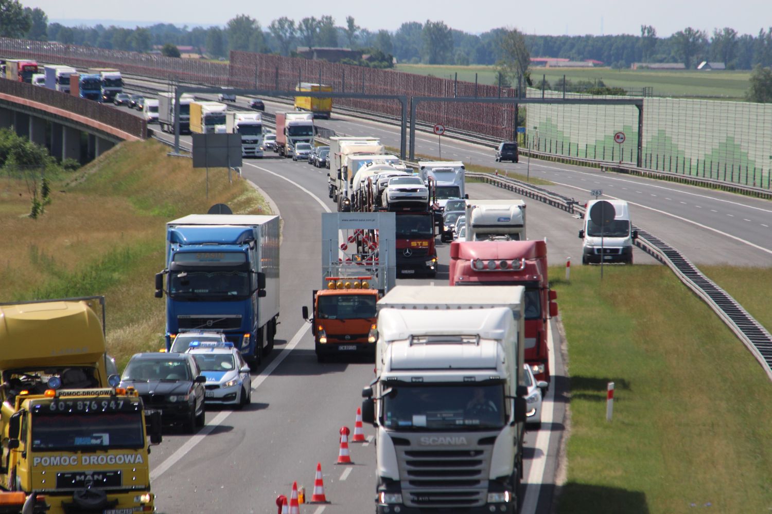 Na miejscu działały służby – policja, pomoc drogowa oraz jednostka straży pożarnej z OSP Krzyżanów. Nie było konieczne zadysponowanie na autostradę zespołu ratownictwa medycznego, gdyż w wyniku zdarzenia nikt nie został poszkodowany.