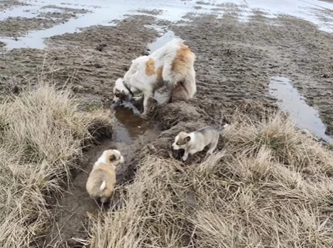 Pojawili się w okolicach miejscowości Zleszyn w gminie Bedlno w powiecie kutnowskim. Jak opisują, pracownicy obsługi wiatraków znaleźli dużą suczkę z czwórką około pięciotygodniowych szczeniaków.