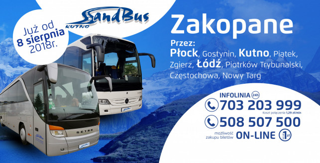 Teraz to jeszcze prostsze, gdyż do Zakopanego dojedziesz bezpośrednio komfortowm autokarem z klimatyzacją. Już od 8 sierpnia 2018 roku, Sandbus - przewoźnik z 9 letnim doświadczeniem otwiera nowe połączenie z Płocka do Zakopanego, przez Płock, Gostynin, Kutno, Piątek, Zgierz, Łódź, Piotrków Trybunalski, Częstochowę oraz Nowy Targ. Zakopane z Sandbusem, sprawdź i przekonaj się sam!