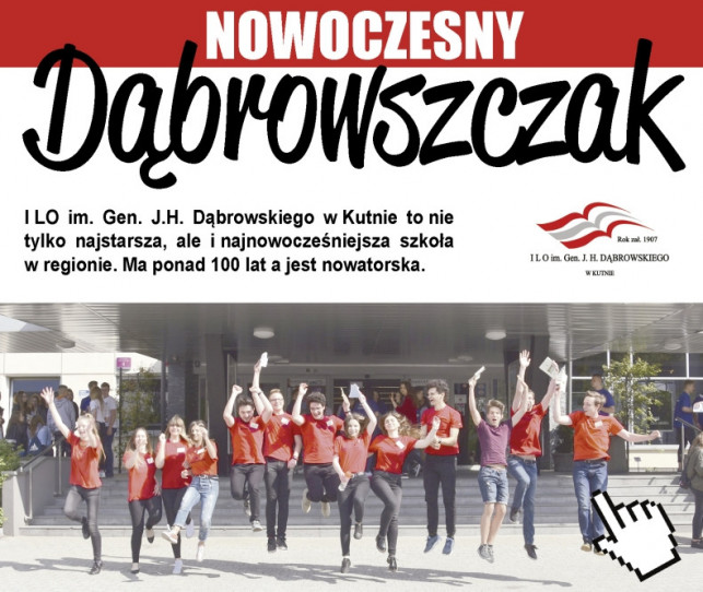 I LO im. Gen. J.H. Dąbrowskiego w Kutnie to nie tylko najstarsza, ale i najnowocześniejsza szkoła regionie. Ma ponad 100 lat a jest nowatorska. Nowoczesny wystrój całej szkoły, sukcesywnie unowocześniane pracownie (w tym roku pracownia chemiczna). Tablice interaktywne, rzutniki multimedialne, laptopy w każdej klasie. Nowoczesna pracownia informatyczna (drukarka 3D, roboty Lego Mindstorm EV3) i językowa. Klimatyzowana sala gimnastyczna, siłownia, boisko wielofunkcyjne. Uczniowie mają możliwość odpoczynku na terenie rekreacyjnym szkoły: ławeczki, hamaki, leżaki wśród zieleni i róż. Darmowe wi-fi, bistro z możliwością zjedzenia ciepłego posiłku, radiowęzeł oraz TV Dąbrowszczak umila każdy dzień nauki. 100 % zdawalność matury w I LO to nie tylko tradycyjne lekcje, ale także innowacyjne nauczanie poprzez rozwijanie pasji i zdolności uczniów, realizowanie marzeń. Konwersacje z native speakerem. Nowatorskie kształtowanie umiejętności interpersonalnych. Warsztaty dziennikarskie w radio Victoria. Samodzielne przeprowadzanie oraz montowanie sond ulicznych czy wywiadów, relacje ze szkolnych uroczystości. Czasopismo szkolne „Przebojem” wydawane od 1923 roku. Grupa ratownictwa medycznego OSP Dąbrowszczak jest jedyną taką w Polsce. Umożliwia zdobycie umiejętności z zakresu zabezpieczenia medycznego imprez lokalnych i ogólnopolskich oraz ukończenie kursu KPP. Kurs Kwalifikowanej Pierwszej Pomocy daje możliwość zdobycia punktów rekrutacyjnych wszystkim starającym się o pracę w służbach mundurowych (policja, wojsko, straż) oraz kandydatom na ratownika WOPR. OSP Dąbrowszczak to także ratownictwo wodne czyli kurs dla płetwonurków. I LO to także niekonwencjonalna współpraca ECO Kutno Sp. z o. o.