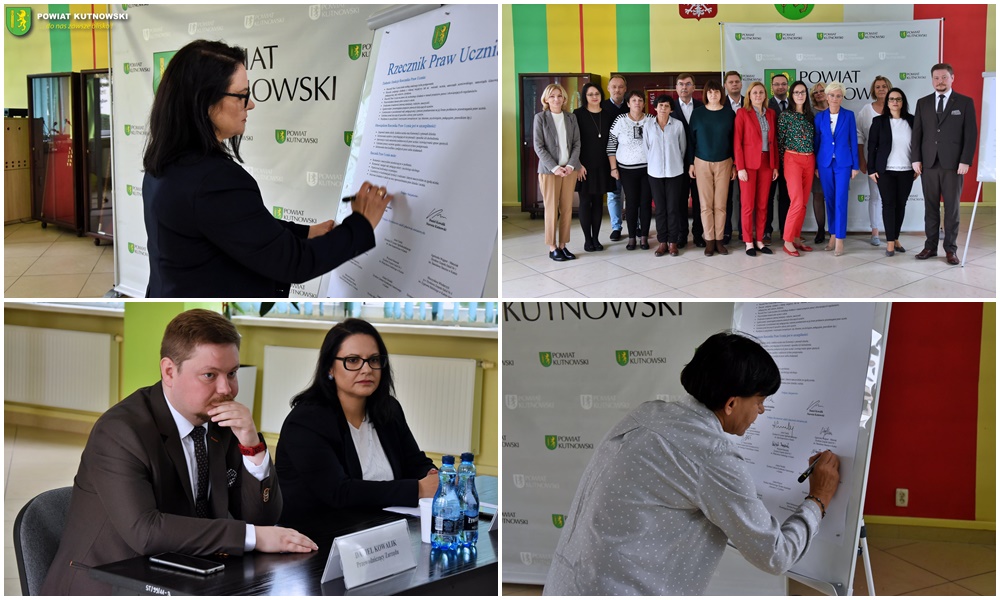 30 września w Starostwie Powiatowym w Kutnie, Starosta Kutnowski Daniel Kowalik, Wicestarosta Magdalena Krupińska-Kotulska oraz Dyrektorzy szkół i jednostek oświatowych podpisali uroczystą deklarację powołania w każdej ze szkół Rzecznika Praw Ucznia.