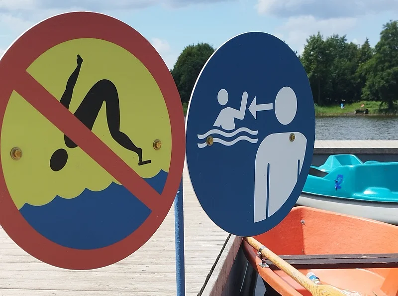 Bardzo lekkomyślne jest pływanie w miejscach gdzie kąpiel jest zakazana i w żadnym wypadku nie należy tego robić. O zakazie informują znaki i tablice. Nie pływaj na odcinkach szlaków żeglugowych oraz w pobliżu urządzeń i budowli wodnych.