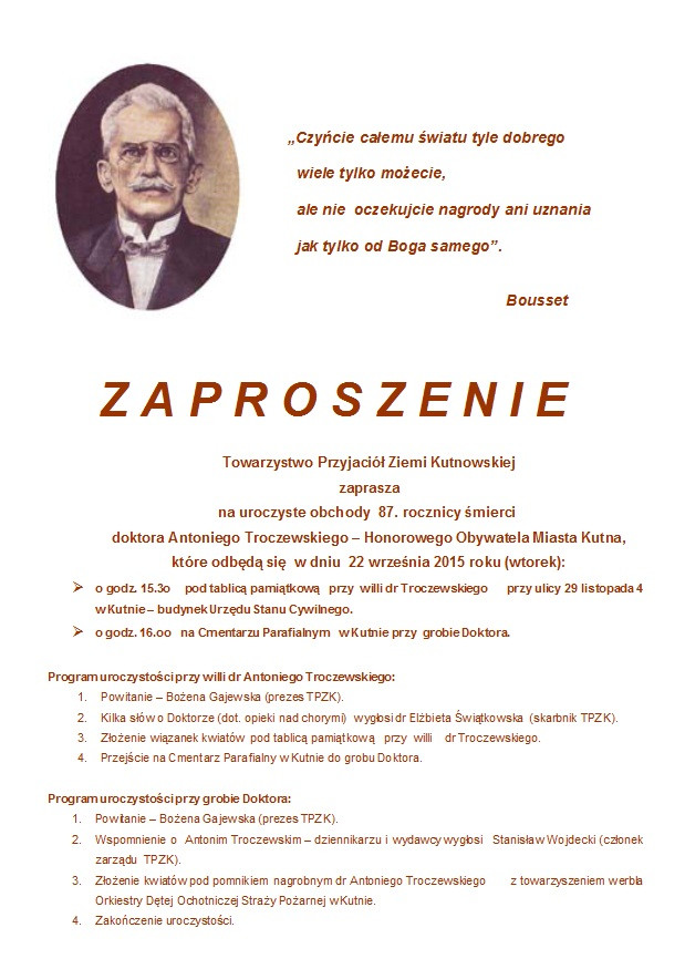 Towarzystwo Przyjaciół Ziemi Kutnowskiej zaprasza na uroczyste obchody 87. rocznicy śmierci doktora Antoniego Troczewskiego – Honorowego Obywatela Miasta Kutna, które odbędą się w dniu 22 września 2015 roku (wtorek):
