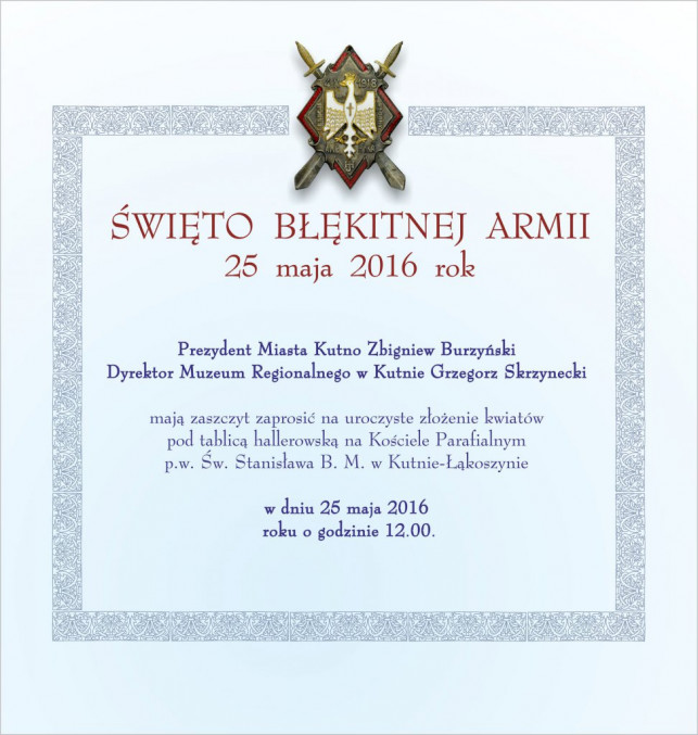 Prezydent Miasta Kutno oraz dyrektor Muzeum Regionalnego w Kutnie zapraszają do udziału w obchodach Święta Błękitnej Armii. Uroczyste złożenie kwiatów pod tablicą hallerowską na Kościele Parafialnym p.w. Św. Stanisława B. M. w Kutnie-Łąkoszynie odbędzie się w środę 25 maja o godz. 12.