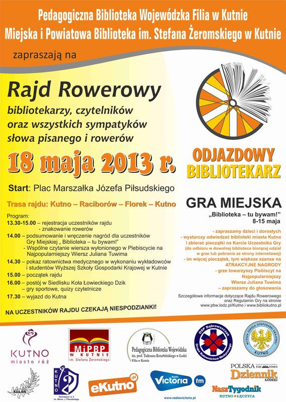 WydarzeniaZ okazji obchodów Tygodnia Bibliotek 2013 w dniach 8–15 maja Pedagogiczna Biblioteka Wojewódzka w Łodzi Filia w Kutnie wraz z Miejską i Powiatową Biblioteką Publiczną, przy udziale bibliotek szkolnych i biblioteki Wyższej Szkoły Gospodarki Krajowej w Kutnie, zapraszają do gry miejskiej - Biblioteka - tu bywam.W grze może wziąć udział każdy. Wystarczy odebrać Kartę Uczestnika Gry. Gracze mogą zobaczyć, jak wyglądają kutnowskie biblioteki. Mają wyjątkową okazję wejść nie tylko do ogólnodostępnych bibliotek - miejskiej czy pedagogicznej, dla uczestników naszej zabawy swoje podwoje otworzą biblioteki szkolne (biblioteka Szkoły Podstawowej nr 6 i Gimnazjum nr 2 w Kutnie) oraz biblioteka WSGK w Kutnie.