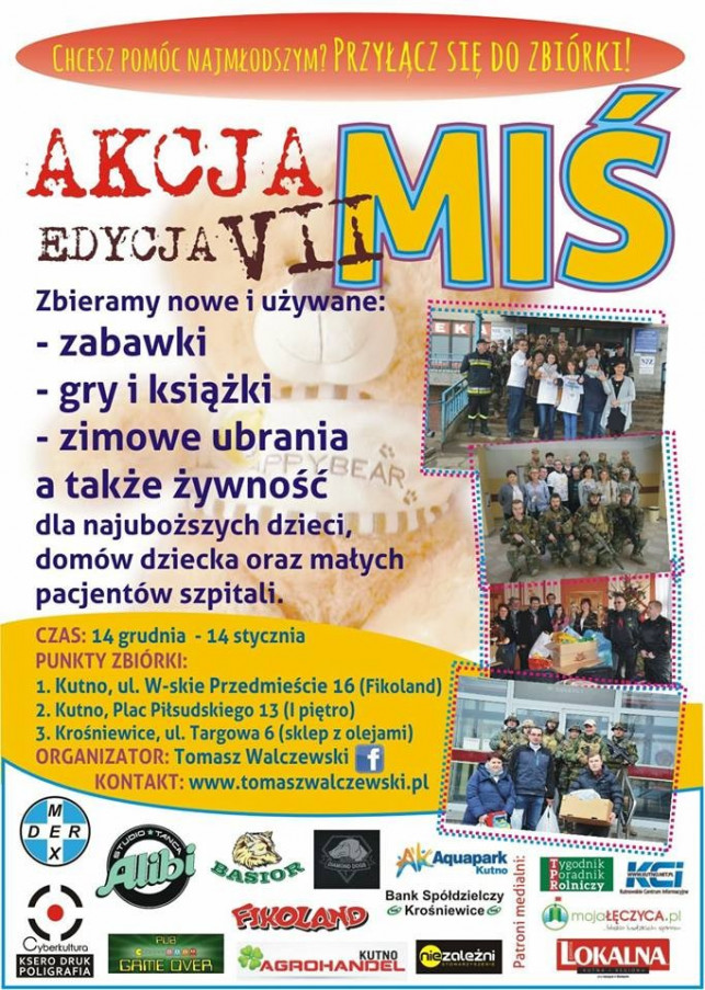 Wszystkie datki na tegoroczną edycję Akcji Miś można przekazywać w kutnowskim „Fikolandzie” przy ulicy Warszawskie Przedmieście 16. Drugi punkt zbiorczy to Pub Game Over przy Placu Piłsudskiego 13, a w Krośniewicach sklep z olejami przy ul Targowej 6 Serdecznie zapraszamy do udziału osoby o szlachetnym sercu!
