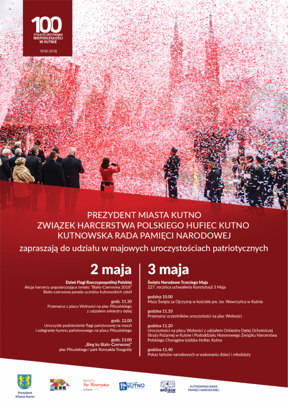 Prezydent Miasta Kutna, Związek Harcerstwa Polskiego Hufiec Kutno oraz Kutnowska Rada Pamięci Narodowej zapraszają na patriotyczne obchody 2 i 3 maja.