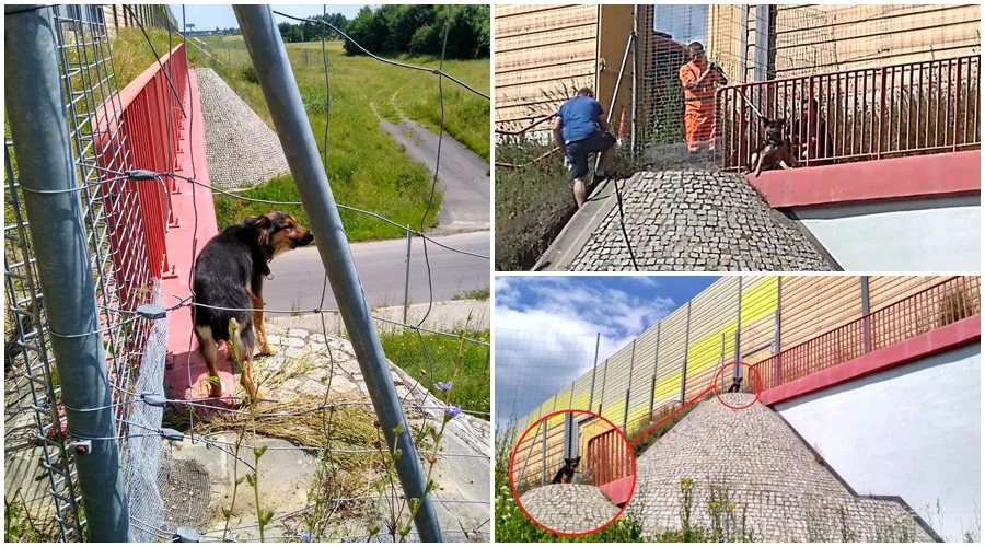 Od razu udaliśmy się na miejsce. Faktycznie zastaliśmy tam psa przebywającego na pełnym słońcu. Od dwóch stron zwierzakowi drogę ewakuacji odcinała siatka, od jednej strome zbocze, a od kolejnej wąski gzyms. Kilka metrów pod nim biegła droga. Jeśli trudno to sobie wyobrazić zapraszamy do galerii zdjęć.