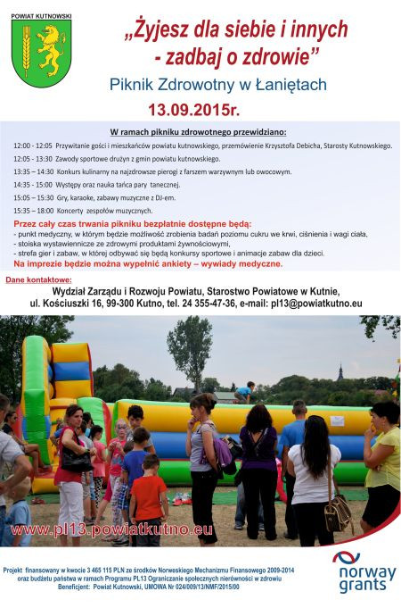Starostwo Powiatowe w Kutnie zaprasza mieszkańców powiatu kutnowskiego na Piknik Zdrowotny, który odbędzie się 13 września o godzinie 12 w Łaniętach. Podczas pikniku przewidziano wiele atrakcji m.in.: zawody sportowe, gry, karaoke, koncerty zespołów muzycznych, konkurs kulinarny. Również bezpłatnie skorzystać będzie można z: punktu medycznego, w którym będzie możliwość zrobienia badań poziomu cukru we krwi, ciśnienia i wagi ciała, stoiska wystawienniczego ze zdrowymi produktami żywnościowymi oraz strefy gier i zabaw.
