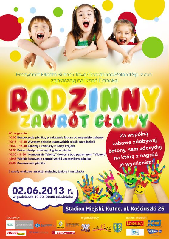 WydarzeniaPrezydent Miasta Kutno i Teva Operations Poland Sp. z.o.o. zapraszają na Dzień Dziecka. Impreza ph "Rodzinny zawrót głowy" odbędzie się w niedzielę, 2 czerwca na Stadionie Miejskim (ul. Kościuszki 26) w Kutnie.Start pikniku przewidziano na godzinę 10 i potrwa on dziesięć godzin. Organizatorzy przygotowali trzy strefy wiekowe: maluch, junior i nastolatek.