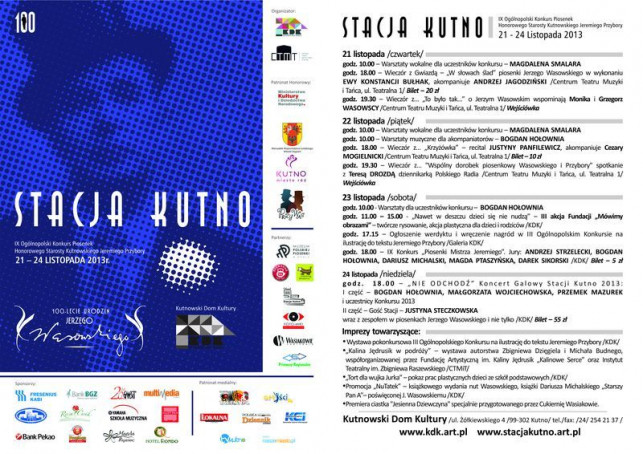 - 18:00 – "NIE ODCHODŹ" Koncert Galowy Stacji Kutno 2013: I część – BOGDAN HOŁOWNIA, MAŁGORZATA WOJCIECHOWSKA, PRZEMEK MAZUREK i uczestnicy Konkursu 2013 II część – Gość Stacji – JUSTYNA STECZKOWSKA wraz z zespołem w piosenkach Jerzego Wasowskiego i nie tylko/KDK, Bilet – 55 zł