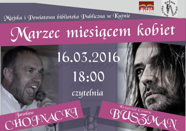 Zwieńczeniem projektu "Marzec miesiącem kobiet" będzie niezwykle klimatyczny występ poety Krzysztofa Cezarego Buszmana i pieśniarza Jarosława Chojnackiego.