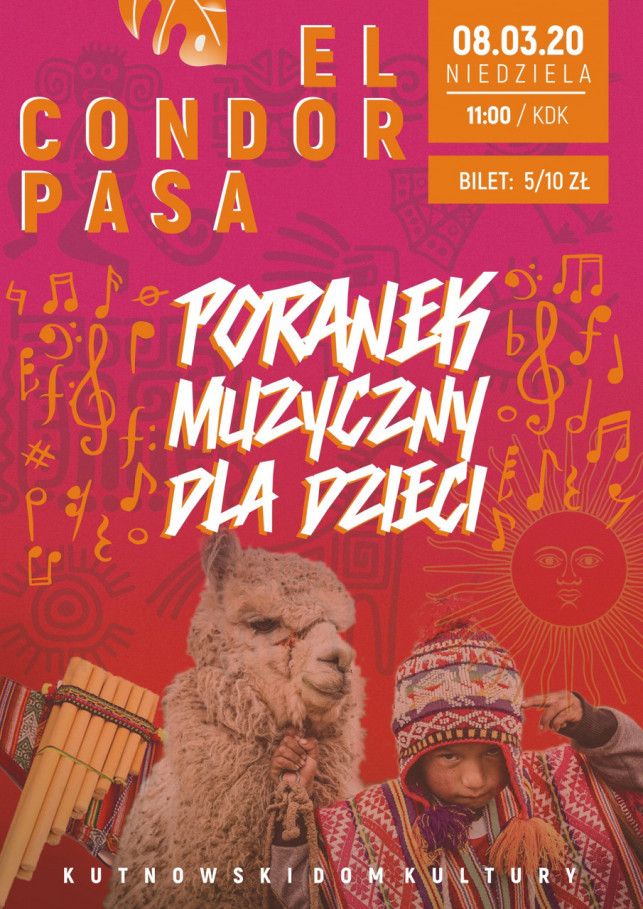 Poranek muzyczny dla dzieci pt. "El Condor Pasa". Spotykamy się w Sali Tarasowej Kutnowskiego Domu Kultury 8 marca o godz. 11:00.