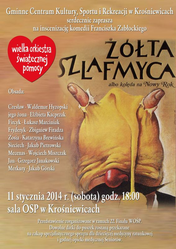 Gminne Centrum Kultury, Sportu i Rekreacji w Krośniewicach zaprasza na inscenizację komedii Franciszka Zabłockiego "Żółta szlafmyca". Występ odbędzie się w sobotę, 11 stycznia o godzinie 18:00 w sali OSP w Krośniewicach.