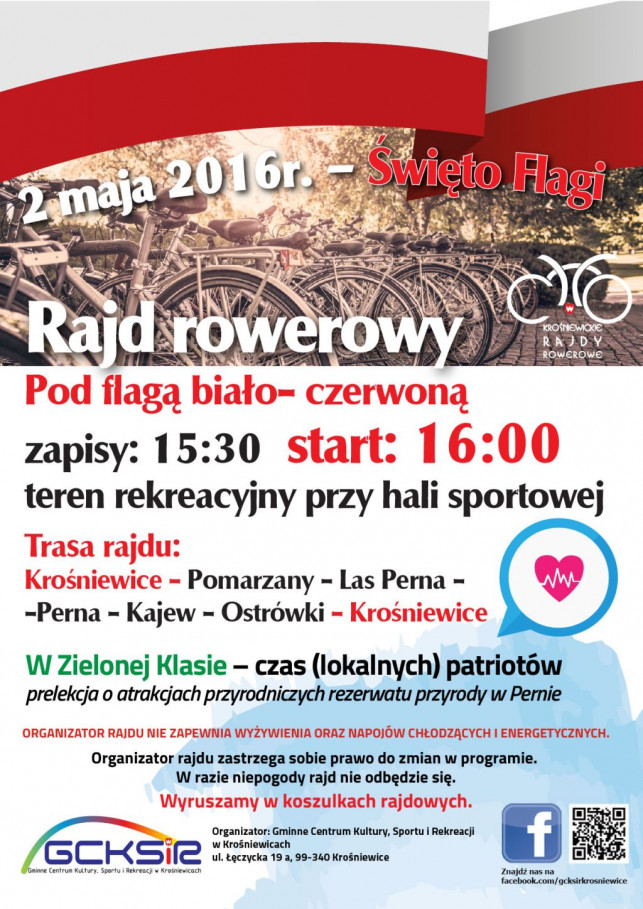 2 maja o godzinie 16 na terenach rekreacyjnych hali sportowej w Krośniewicach odbędzie się rajd rowerowy pod flagą biało-czerwoną.