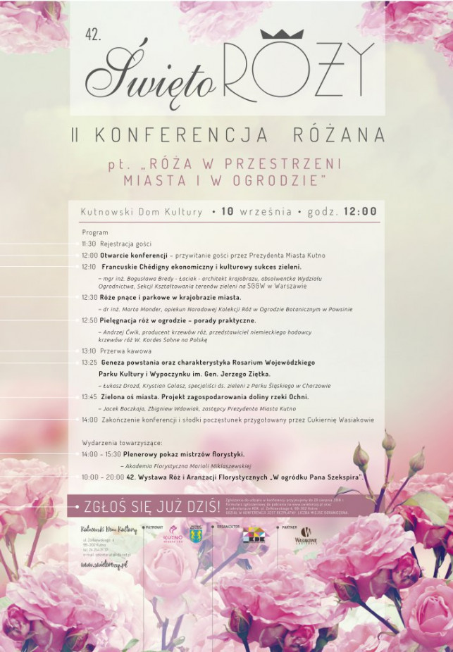 W ramach tegorocznej Konferencji odbędą się między innymi spotkania z architektami krajobrazu, producentami róż ogrodowych, specjalistami do spraw miejskiej zieleni, a także plenerowy pokaz mistrzów florystyki. Dlatego jeśli chcecie się Państwo dowiedzieć jak pielęgnować róże ogrodowe, jak wygląda roślinny projekt zagospodarowania kutnowskiej doliny rzeki Ochni, albo jak małe francuskie miasto Chedigny odniosło „zielony” sukces na skalę europejską, koniecznie weźcie udział w tegorocznej Konferencji Różanej.