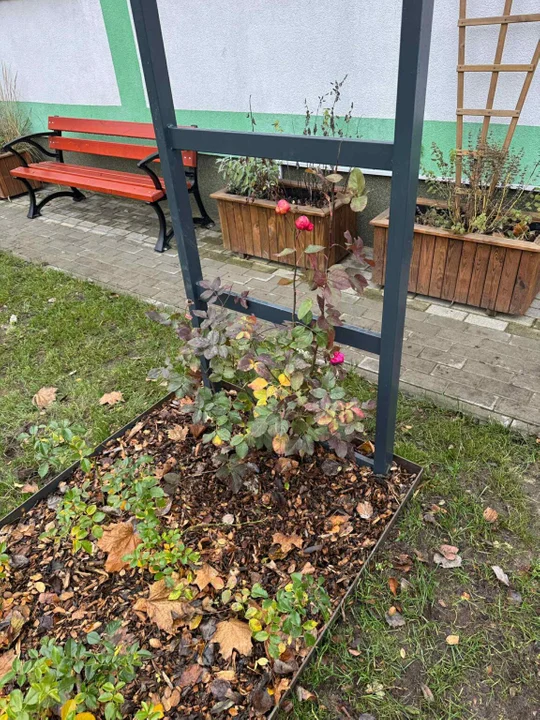 Na skwerku pojawiły się elementy małej architektury – ławki, kosze i konstrukcje pod róże pnące.