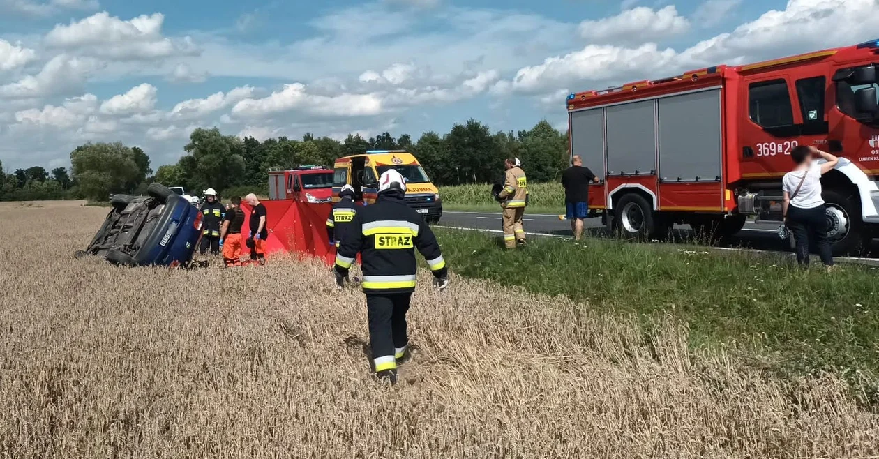 W poniedziałek (14 sierpnia), ok. godz. 14:00 służby zostały zadysponowane do miejscowości Rutkowice (gmina Lubień Kujawski), tuż przy granicy z gminą Krośniewice. Na miejscu zdarzenia okazało się, że samochód osobowy (na kutnowskich numerach) na łuku drogi wypadł z jezdni, po czym dachował w polu.