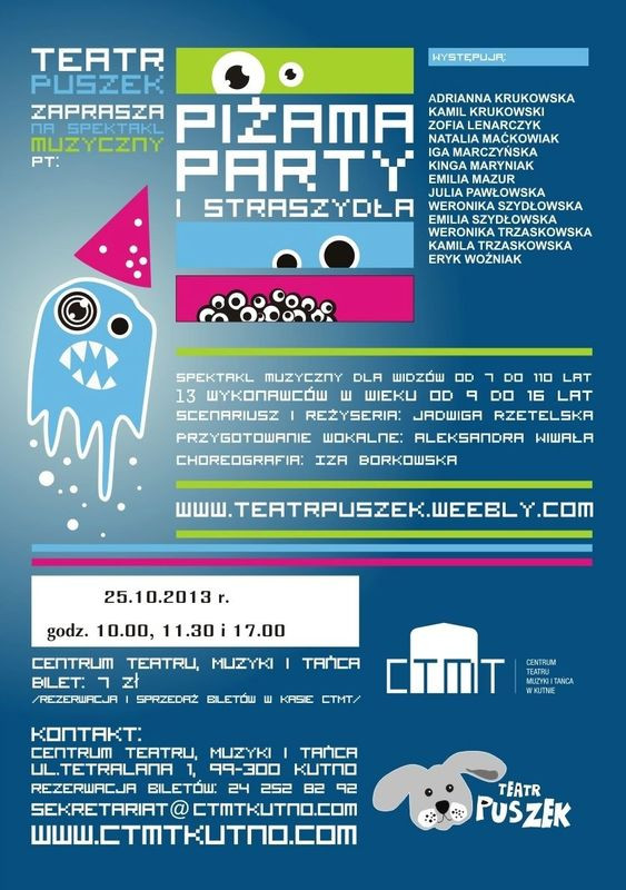 Teatr Puszek z Kutnowskiego Domu Kultury zaprasza na spektakl muzyczny pt. "Piżama Party i Straszydła". W piątek, 25 października dla wszystkich miłośników kutnowskiej młodzieży odbędą się trzy pokazy (10:00, 11:30, 17:00) w Centrum Teatru, Muzyki i Tańca. Czas trwania spektaklu to około 50 minut. Bilety w cenie 7 zł do nabycia w kasie CTMiT.