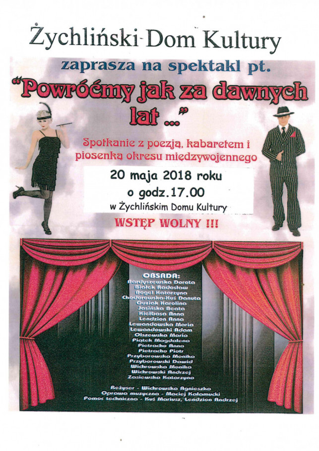 20 maja (niedziela) o godzinie 17:00 w Żychlińskim Domu Kultury będzie gościł Amatorski Teatr Niewielki z Gąbina.