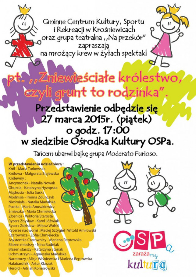 Gminne Centrum Kultury, Sportu i Rekreacji w Krośniewicach oraz grupa teatralna "Na przekór" zapraszają na mrożący krew w żyłach spektakl pt. "Zniewieściałe królestwo czyli grunt to rodzinka".