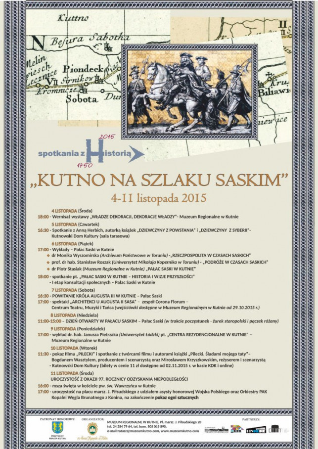 Muzeum Regionalne w Kutnie zaprasza w dniach 4-11 listopada br. na „Spotkania z historią. Kutno na szlaku saskim”. W ramach tegorocznej imprezy można będzie m.in. obejrzeć spektakl „Architekci u króla Augusta II Sasa” w wykonaniu zespołu tańca dworskiego Corona Florum, zwiedzić Pałac Saski w Kutnie podczas badań archeologicznych czy wziąć udział w spotkaniu z Anną Herbich, autorką książek „Dziewczyny z Powstania” i „Dziewczyny z Syberii”.