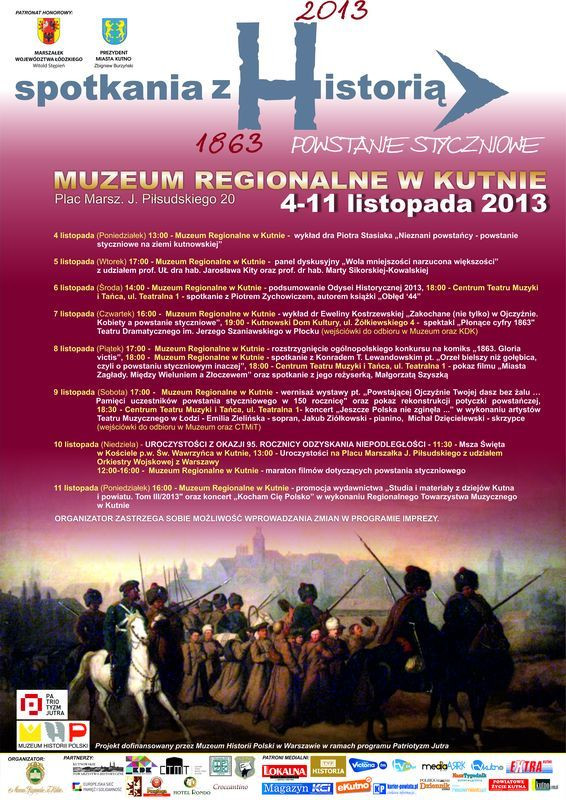 WydarzeniaW dniach 4-11 listopada 2013 roku odbędzie się II edycja „Spotkań z historią”. Tematem wiodącym tegorocznej imprezy organizowanej przez Muzeum Regionalne w Kutnie będzie powstanie styczniowe. Program przewiduje kilkadziesiąt wydarzeń, m.in: wernisaż wystawy poświęconej powstaniu styczniowemu, pokaz rekonstrukcji historycznej, pokaz filmów, wykłady, konkursy dla dzieci i młodzieży szkolnej., koncerty.Odbędą się 2 spotkania autorskie: z Piotrem Zychowiczem, autorem książek „Pakt Ribbentrop-Beck” i „Obłęd '44” oraz z Konradem Lewandowskim, autorem książki „Orzeł bielszy niż gołębica”. Na scenie KDK Teatr Dramatyczny im. Jerzego Szaniawskiego z Płocka zaprezentuje spektakl „Płonące cyfry 1863”.