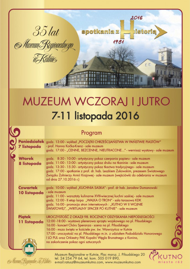 Muzeum Regionalne w Kutnie zaprasza w dniach 7-11 listopada na „Spotkania z historią. Muzeum wczoraj i jutro”. Tegoroczna edycja imprezy połączona została z jubileuszem 35-lecia Muzeum. W jej ramach odbędą się, m.in. warsztaty kulinarne przygotowane we współpracy z Zespołem Szkół Zawodowych nr 2 im. dr. A. Troczewskiego oraz spotkanie z prof. dr. hab. Leszkiem Żukowskim, prezesem Światowego Związku Żołnierzy Armii Krajowej.