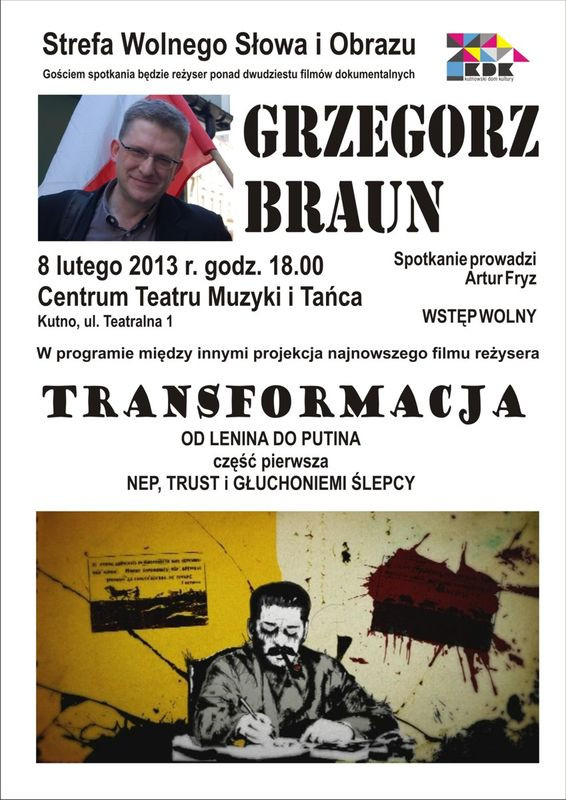 Atrakcją wieczoru z reżyserem Grzegorzem Braunem, który rozpocznie się 8 lutego 2013 r. o godz. 18.00 w Centrum Teatru Muzyki i Tańca w Kutnie przy ul. Teatralnej 1 będzie nie tylko możliwość rozmowy z głośnym reżyserem, ale również okazja zobaczenia najnowszego jego filmu pt. „Transformacja”.