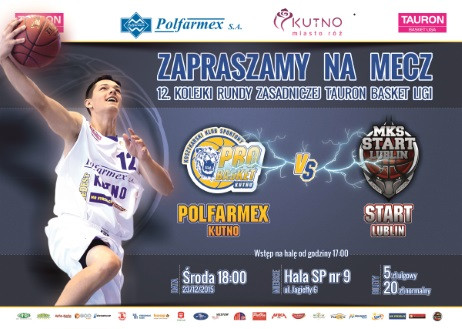 WydarzeniaKKS PRO BASKET KUTNO S.A. informuje, iż w siedzibie klubu od dnia 18 grudnia 2015 roku (piątek) od godziny 9.00 rusza sprzedaż biletów na mecz Polfarmex Kutno Start Lublin. Mecz odbędzie się w dniu 23 grudnia 2015 roku (środa) o godzinie 18.00 w hali sportowej przy szkole podstawowej nr 9 w Kutnie. Bilety do nabycia będą w biurze klubu mieszczącego się w Kutnie przy ulicy Kościuszki 26.Ceny biletów:5 zł bilet ulgowy - bilet ulgowy przysługuje dzieciom i młodzieży szkół podstawowych, gimnazjalnych za okazaniem ważnej legitymacji,20 zł bilet normalny.