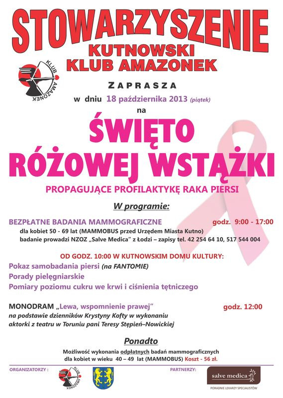 Stowarzyszenie Kutnowski Klub Amazonek zaprasza w piątek, 18 października na Święto Różowej Wstążki propogujące profilaktykę raka piersi. W programie: bezpłatne badania mammograficzne dla kobiet 50 - 69 lat (Mammobus przed Urzędem Miasta Kutno w godzinach 9:00 - 17:00, zapisy (42) 254-64-10 lub 517-544-004.