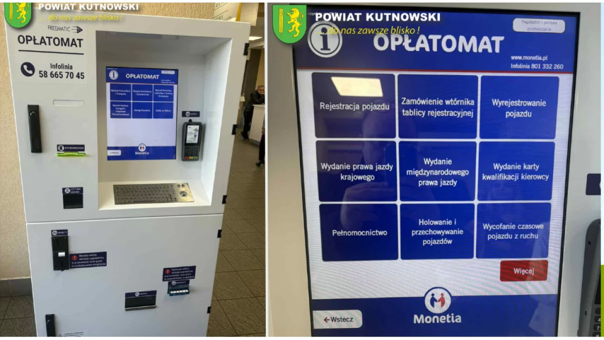 Mieszkańcy Kutna zyskają nową możliwość załatwiania spraw urzędowych bez stania w kolejkach. W budynku Starostwa Powiatowego przy ulicy Królowej Jadwigi 7 stanął opłatomat - samoobsługowe urządzenie umożliwiające dokonywanie wpłat za rejestrację pojazdów oraz inne czynności urzędowe.Nowoczesny sprzęt zostanie udostępniony petentom już 17 listopada 2025 roku.