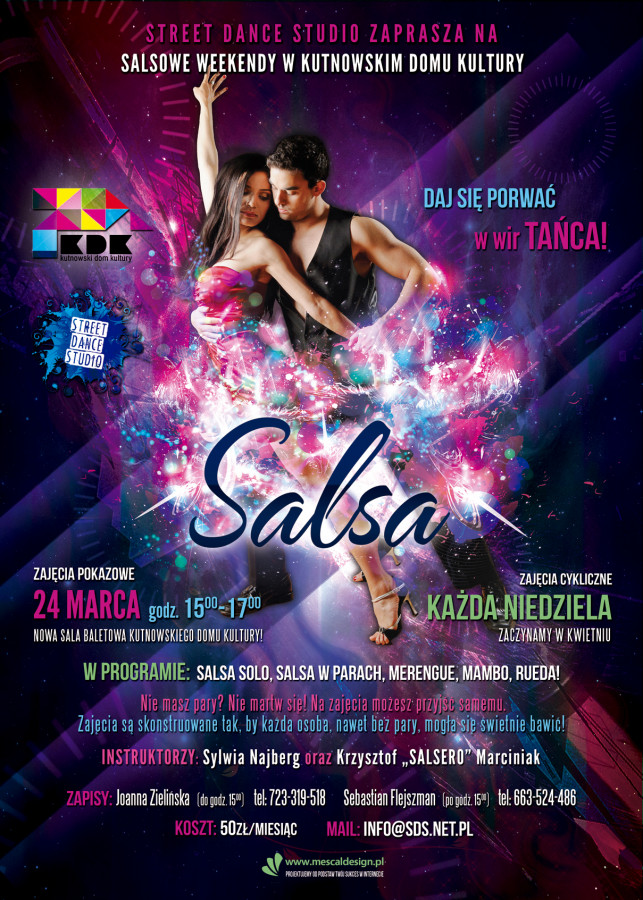 WydarzeniaKutnowski Dom Kultury oraz Street Dance Studio zapraszają wszystkich na cykl zajęć tanecznych "Weekendowe popołudnia salsowe".Już 12 maja zapraszamy na niepowtarzalne zajęcia dla dorosłych z salsy kubańskiej, merengue, ruedy, mambo! Zapraszamy na zajęcia w parach, lecz osoby, które takowej nie posiadają również mogą przyjść na zajęcia.