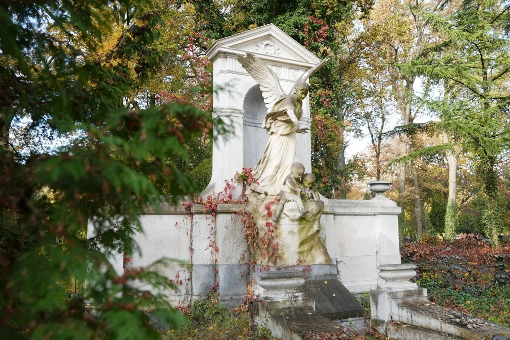 - To rodzice jej rodzice ufundowali pomnik niezwykły, który jest przykładem wzorców zaczerpniętych z Włoch. Pomnik wykonano z białego marmuru karraryjskiego w rzymskiej pracowni niemieckiego rzeźbiarza Otto Lessinga i sprowadzono do Łodzi w 1898 roku. Dzieło przedstawia anioła – o rysach twarzy Sophie – pochylającego się nad dwójką chłopców symbolizujących jej synów. Dzieci stoją na krawędzi urwiska, a anioł zdaje się powstrzymywać ich przed upadkiem – to metafora opieki, miłości i nieustannej obecności matki – mówi Cezary Pawlak.