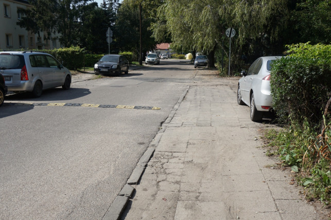 W miejscu istniejących chodników projektuje się zatoki postojowe. Nowy chodnik będzie przebiegał bezpośrednio przy zatokach postojowych. Przed budynkami wielorodzinnymi od strony ulicy projektowana jest opaska z kostki betonowej oraz tereny zielone. Przewidziano również poprawę bezpieczeństwa ruchu poprzez zamontowanie progu zwalniającego i wykonanie nowego oznakowania pionowego i poziomego.