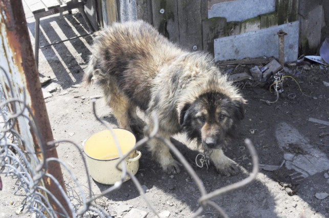 Pies przywiązany jest do krótkiego łańcucha. Zwierzak jest wychudzony i zaniedbany. Widać, że od dawna nie zjadł porządnego posiłku.