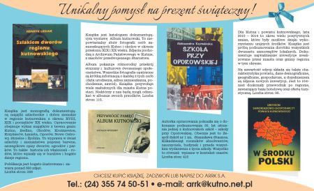 "Przywrócić pamięć. Album kutnowski"; Książka jest katalogiem dokumentują - cym wystawę Album kutnowski. To nie - powtarzalny zbiór fotografii osób za - mieszkujących Kutno i okolice w okresie przełomu XIX i XX wieku. Zdjęcia pocho - dzą z Archiwum Państwowego w Kutnie, z zasobów przedwojennego Starostwa. Album pokazuje różnorodny przekrój etniczny i kulturowy ówczesnego społe - czeństwa. Wszystkie fotografie opatrzone są krótką informacją o każdej z tych osób (data urodzenia, adres zamieszkania, po - chodzenie, zawód). Książka przywołuje wiele zasłużonych dla miasta Kutna po - staci. Niektórzy z nas będą mogli odszu - kać w albumie swoich przodków. Liczba stron: 112.