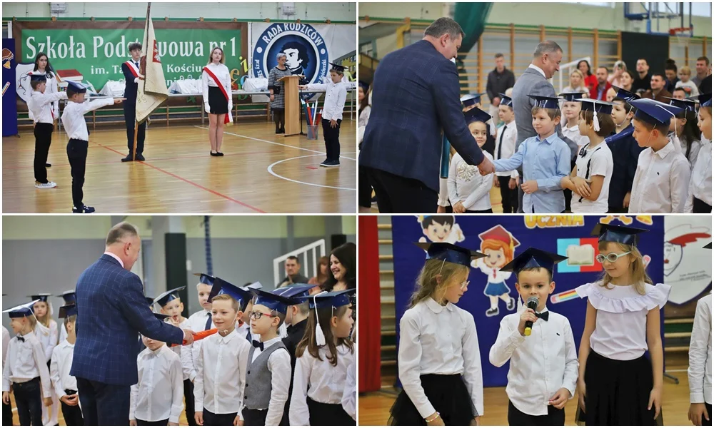 Pierwszaków na uczniów "Jedynki" pasowali: zastępca prezydenta Kutna Jacek Boczkaja, wizytator Kuratorium Oświaty w Łodzi Mariusz Jagielski, dyrekor SP nr 1 Jarosław Koszański i przewodnicząca Rady Rodziców Izabela Jadczak.