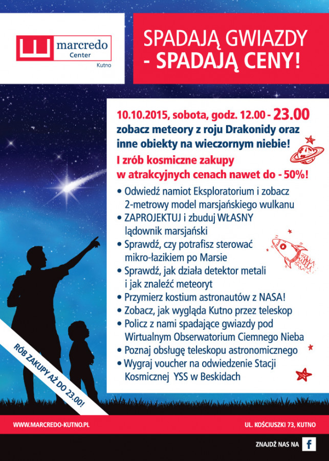 Tego wieczoru marcredo Center Kutno czynne będzie dłużej, bo do godziny 23.00, a spadać będą u nas nie tylko gwiazdy. W sklepach galerii handlowej razem z gwiazdami spadać będą także ceny nawet do -50%. 10 października warto zaplanować wiec dłuższe zakupy.