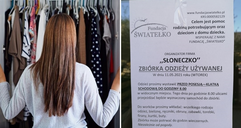 - Odzież prosimy wystawić przed posesją - klatką schodową do godziny 8:00 w widocznym miejscu. Tego dnia po godzinie 8:00 ulicami przejeżdzać będzie wyznaczony samochód do zbiórki. Do worków prosimy wkładać: wszelkiego rodzaju odzież, bieliznę , ręczniki, obrusy, zabawki, torebki, firany, kurtki, buty. Zbiórka może potrwać do godzin wieczornych. Niezależnie od pogody - czytamy na ulotce.