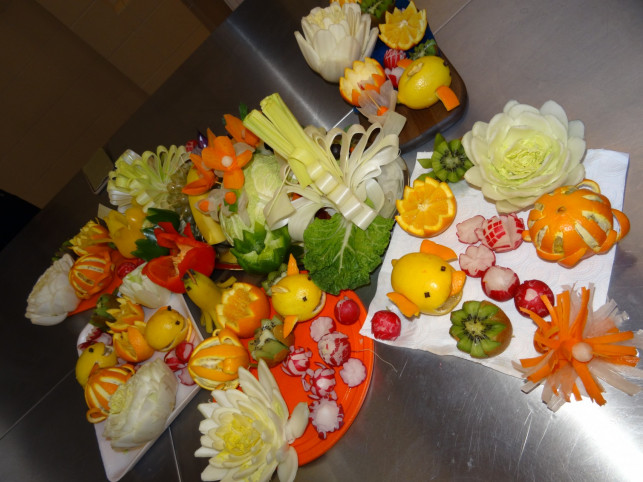 Carving jest sztuką - to dość trafne określenie. Carvingowcy, czyli osoby zajmujące się carvingiem, są zatem artystami. Carving wyodrębnił się z tzw. sztuki pałacowej. Pierwsze wzmianki o fantazyjnym, artystycznym wycinaniu owoców i warzyw pochodzą z Chin, z okresu panowania dynastii Tang (VII - X w.). Rozkwit carvingu miał miejsce nieco później, podczas rządów dynastii Song (X-XIII w.). Właśnie wtedy carving opuścił cesarskie komnaty i pałace. Nie trafił co prawda od razu pod strzechy, ale stał się zdecydowanie bardziej przyjazną formą, zwłaszcza wśród klasy średniej. Dekoracje tworzy się bazując na owocach i warzywach. Do carvingu najczęściej uwżywa się rzodkwi, buraków, różnego rodzaju rzep, brukwi, kabaczka, a także marchwi, selera, kalarepy, papryki. Fantazyjnie przygotowane przez uczestniczki warsztatów elementy kompozycji można podziwiać na zdjęciach.