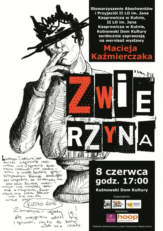 WydarzeniaStowarzyszenie Absolwentów i Przyjaciół II LO im. Jana Kasprowicza w Kutnie, II Liceum Ogólnokształcące im. Jana Kasprowicza w Kutnie, Kutnowski Dom Kultury serdecznie zapraszają mieszkańców Kutna i powiatu kutnowskiego na wernisaż wystawy Macieja Kaźmierczaka pt. "Zwierzyna".Maciej Kaźmierczak jest absolwentem Liceum Kasprowicza w Kutnie, grafikiem, autorem ponad sześćdziesięciu opublikowanych opowiadań i rożnego rodzaju publicystyki.Wystawa będzie ściśle związana ze zbiorem opowiadań pod tym samym tytułem, które powstały w przeciągu ostatnich niecałych czterech lat. Zaprezentuje ona ilustracje, które ozdobią książkę. Dlaczego akurat "Zwierzyna"? Odpowiedź na to pytanie autor pozostawia do jesieni, kiedy to odbędzie się premiera publikacji. Wydaniem książki zajmie się Stowarzyszenie Absolwentów i Przyjaciół II LO im. Jana Kasprowicza w Kutnie.Wystawa odbędzie się 8 czerwca o godz 17.00 w Kutnowskim Domu Kultury.