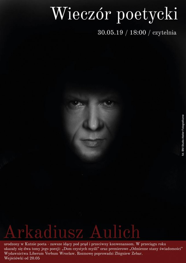 30 maja w kutnowskiej książnicy gościć będzie Arkadiusz Aulich - urodzony w Kutnie poeta. Zawsze idący pod prąd, przeciwnik konwenansów, autor tomów poezji „Dom czystych myśli” czy też premierowego tomu „Odmienne stany świadomości”. Spotkanie odbędzie się 30 maja o godz. 18:00 w czytelni.