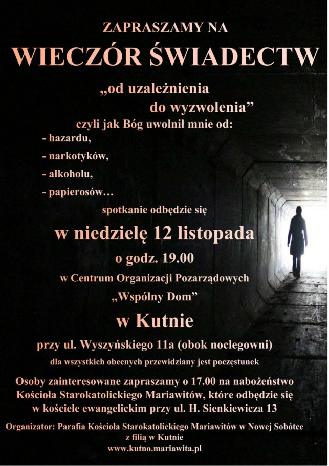 12 listopada o godz. 19:00 w Centrum Organizacji Pozarządowych "Wspólny Dom" w Kutnie (ul. Wyszyńskiego 11a) odbędzie się Wieczór Świadectw "od uzależnienia do wyzwolenia", podczas którego osoby uzależnione od różnych nałogów opowiedzą o swoim nawróceniu.