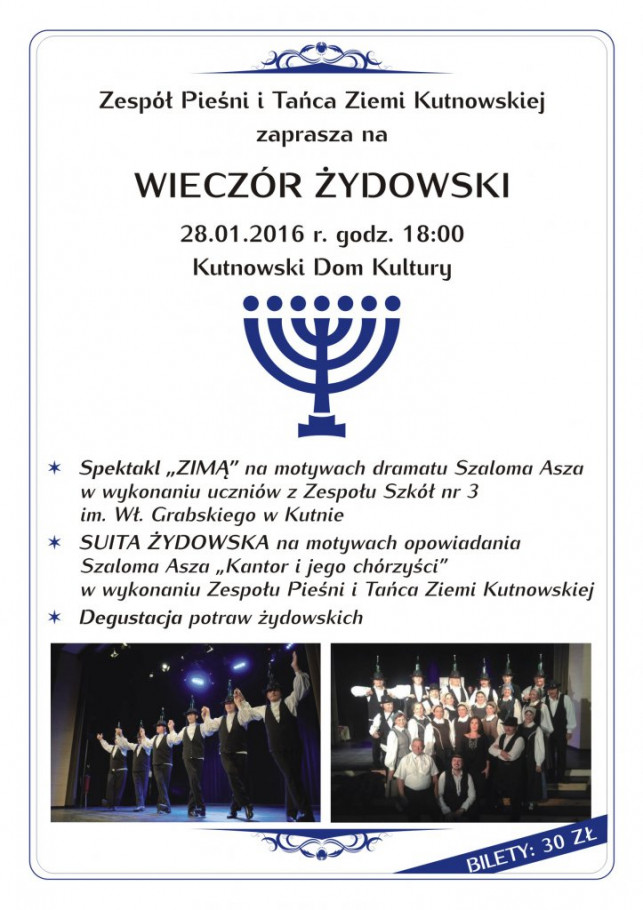 Na scenie wystąpią także uczniowie z Zespołu Szkół nr 3 im. Wł. Grabskiego ze spektaklem "Zimą". Dodatkową atrakcją wieczoru, będzie degustacja tradycyjnych potraw żydowskich. Wydarzenie odbędzie się 28 stycznia o godzinie 18 w Kutnowskim Domu Kultury.