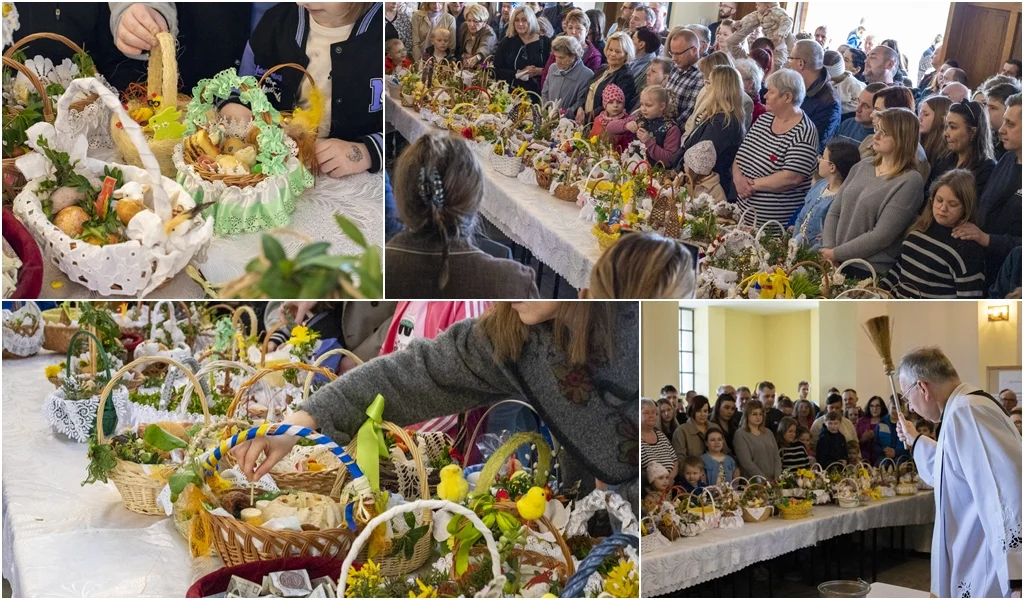 Od rana świątynia pw. św. Jana Chrzciciela wypełniała się mieszkańcami, którzy z koszykami pełnymi świątecznych smakołyków ruszyli na święcenie. Wśród zawartości święconek można było zobaczyć barwne pisanki, czekoladowe zające i misternie przygotowane dekoracje. Koszyki przynosili wszyscy – dzieci z rodzicami, młodzież oraz osoby starsze. Niektórzy zatrzymywali się również na chwilę modlitwy przy grobie Pańskim.